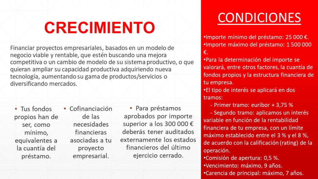 - Plazo y Condiciones Competitivas: Con plazos de amortización que se adaptan a la realidad del proyecto empresarial y condiciones favorables que fomentan el crecimiento.