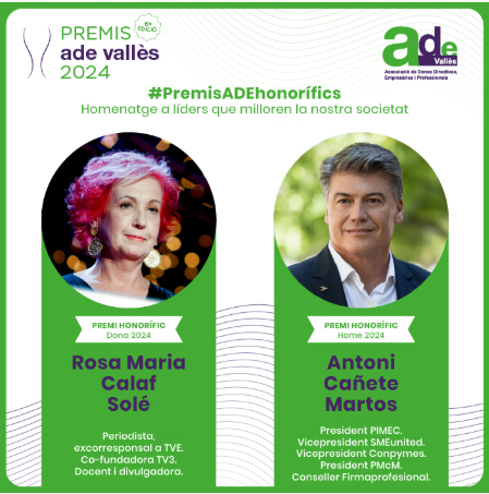 En cuanto a los premios Premis Honorífics ADE este año fueron para la reputada periodista Rosa María Calaf Solé y el actual presidente de PIMEC, Antoni Cañete Martos.